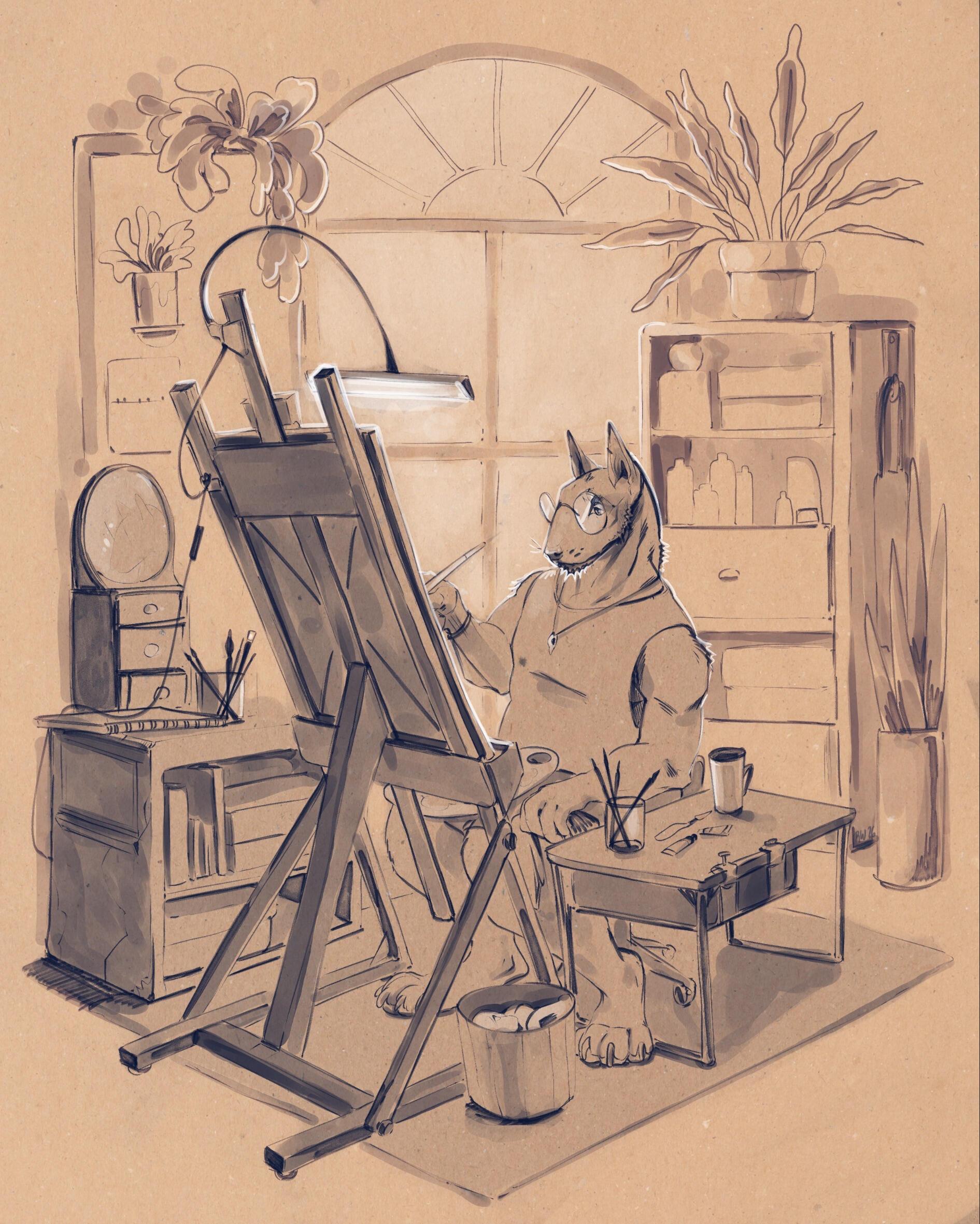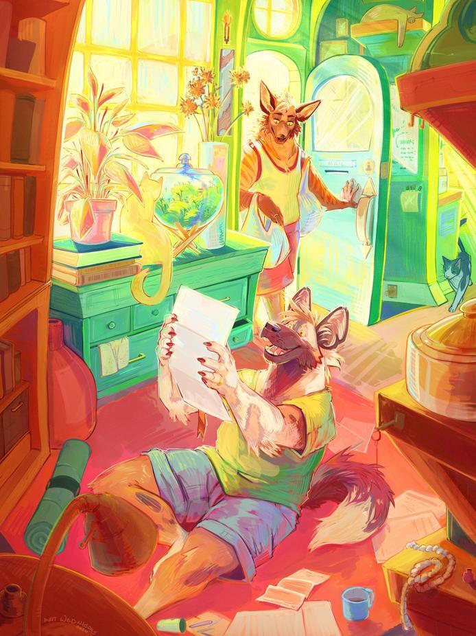 A scene can look like a movie still or a matte painting, a wide shot of an environment or a space that your character has built for themselves, a set piece or a book cover. Sky's the limit.Scenes start at $625 with one character, with +$200 per additional character.Complexity fee (i.e. outfit, silhouette, or markings): generally +30% of base rate.About Full Scene pricing: